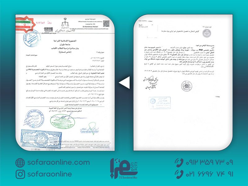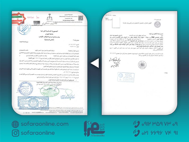 هر یک از سفارتخانهها قوانین و شرایط مخصوص به خود را دارند و ممکن است این قوانین، در هر سال تغییر کند؛ همچنین با توجه به نوع ویزا نیز ممکن است قوانین متفاوتی وجود داشته باشند. برخی از سفارتها، ترجمه رسمی گواهی اشتغال به تحصیل را بدون نیاز تاییدیههای دادگستری و وزارت امور خارجه قبول میکنند، مثل سفارتهای انگلستان و فرانسه؛ اما برخی دیگر، مثل ژاپن و استرالیا، تنها در صورتی ترجمه را قبول دارند که مهر تایید دادگستری و وزارت خارجه در ترجمه وجود داشته باشد.